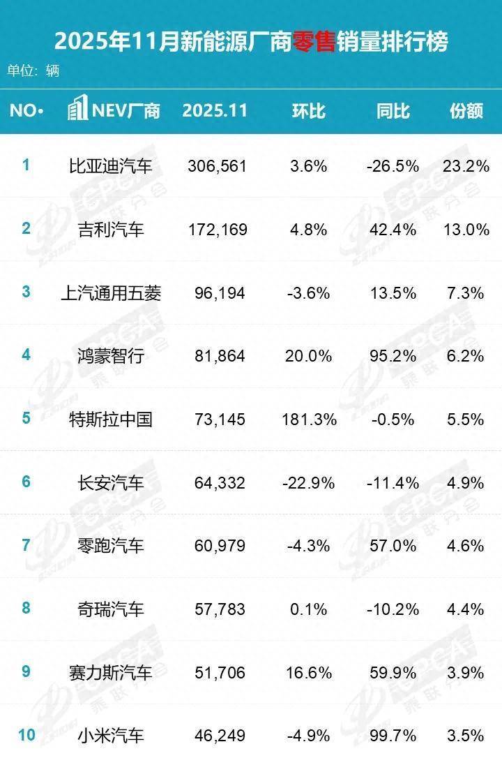 从11月新能源厂商零售销量榜单来看,入榜销量榜前十名的车企分别为比亚迪汽车、吉利汽车、上汽通用五菱、鸿蒙智行、特斯拉中国、长安汽车、零跑汽车、奇瑞汽车、赛力斯汽车、小米汽车。其中,同比涨幅最高的是小米汽车,同比增长99.7%;鸿蒙智行次之,同比增长95.2%。