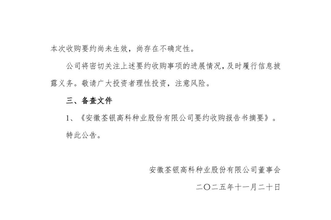 11月20日富盈策略,荃银高科公告称,收到中种集团出具的要约收购报告书摘要。