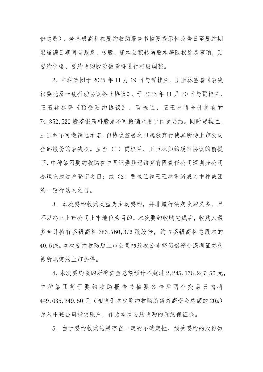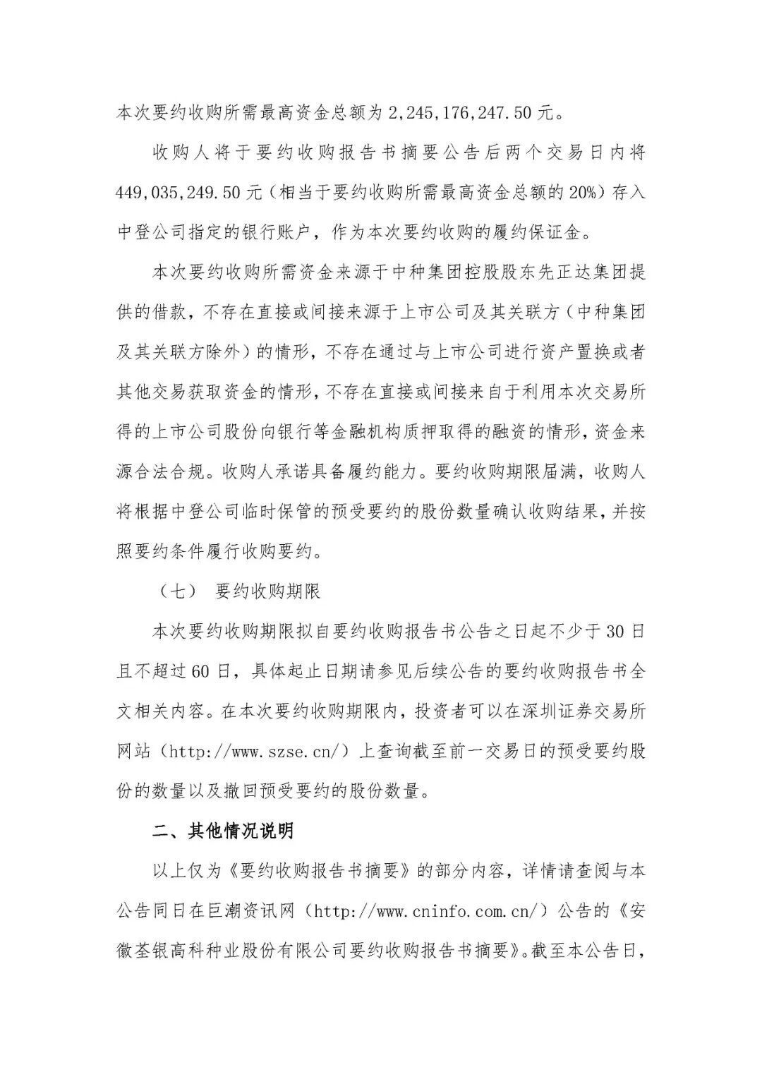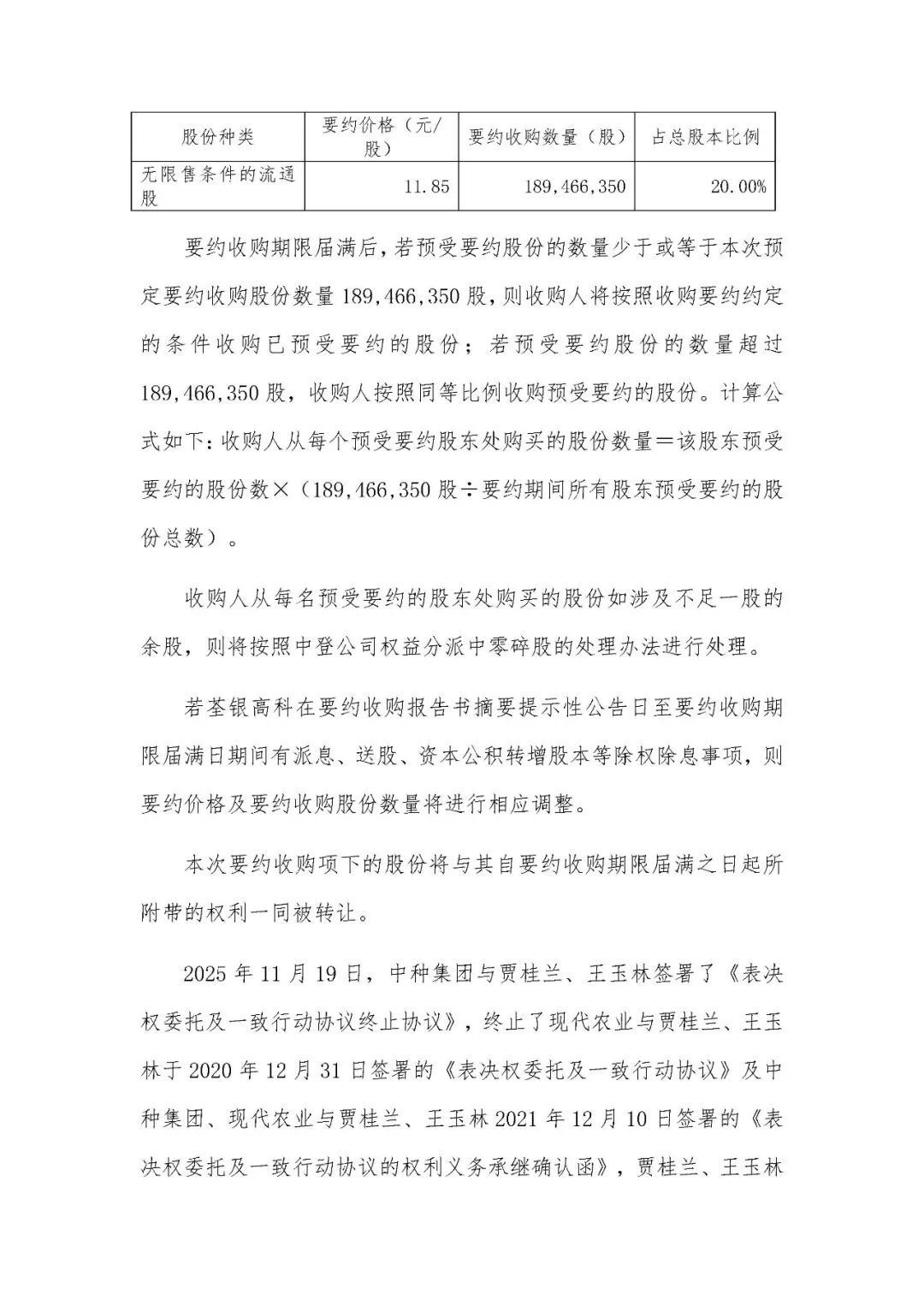 本次要约收购的收购人为中种集团。中种集团拟向除收购人以外的荃银高科全体股东发出部分要约,预定要约收购股份数量为1.89亿股,约占荃银高科已发行股份总数的20.00%,要约收购价格为11.85元/股。本次要约收购所需资金总额预计不超过22.45亿元。