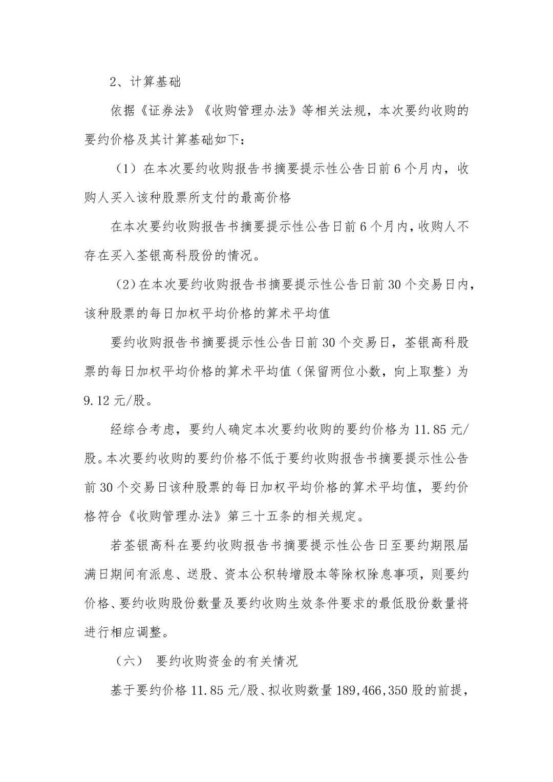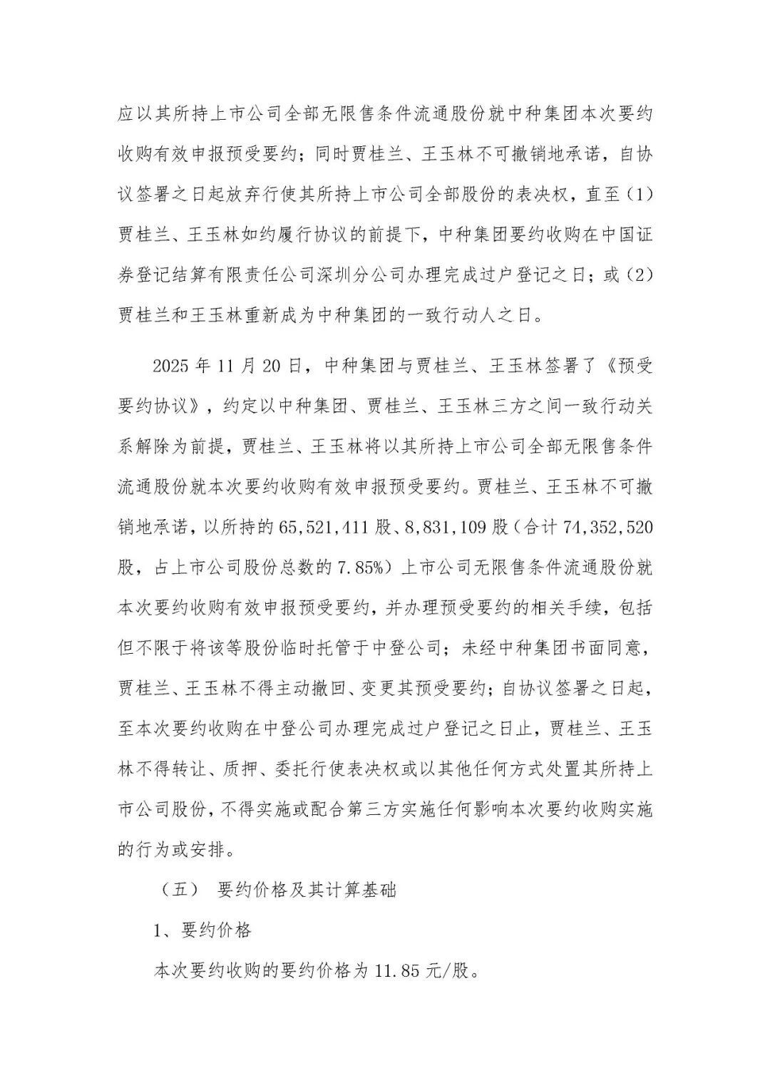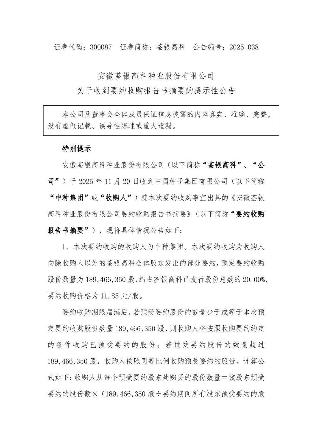本次要约收购的收购人为中种集团。中种集团拟向除收购人以外的荃银高科全体股东发出部分要约,预定要约收购股份数量为1.89亿股,约占荃银高科已发行股份总数的20.00%,要约收购价格为11.85元/股。本次要约收购所需资金总额预计不超过22.45亿元。