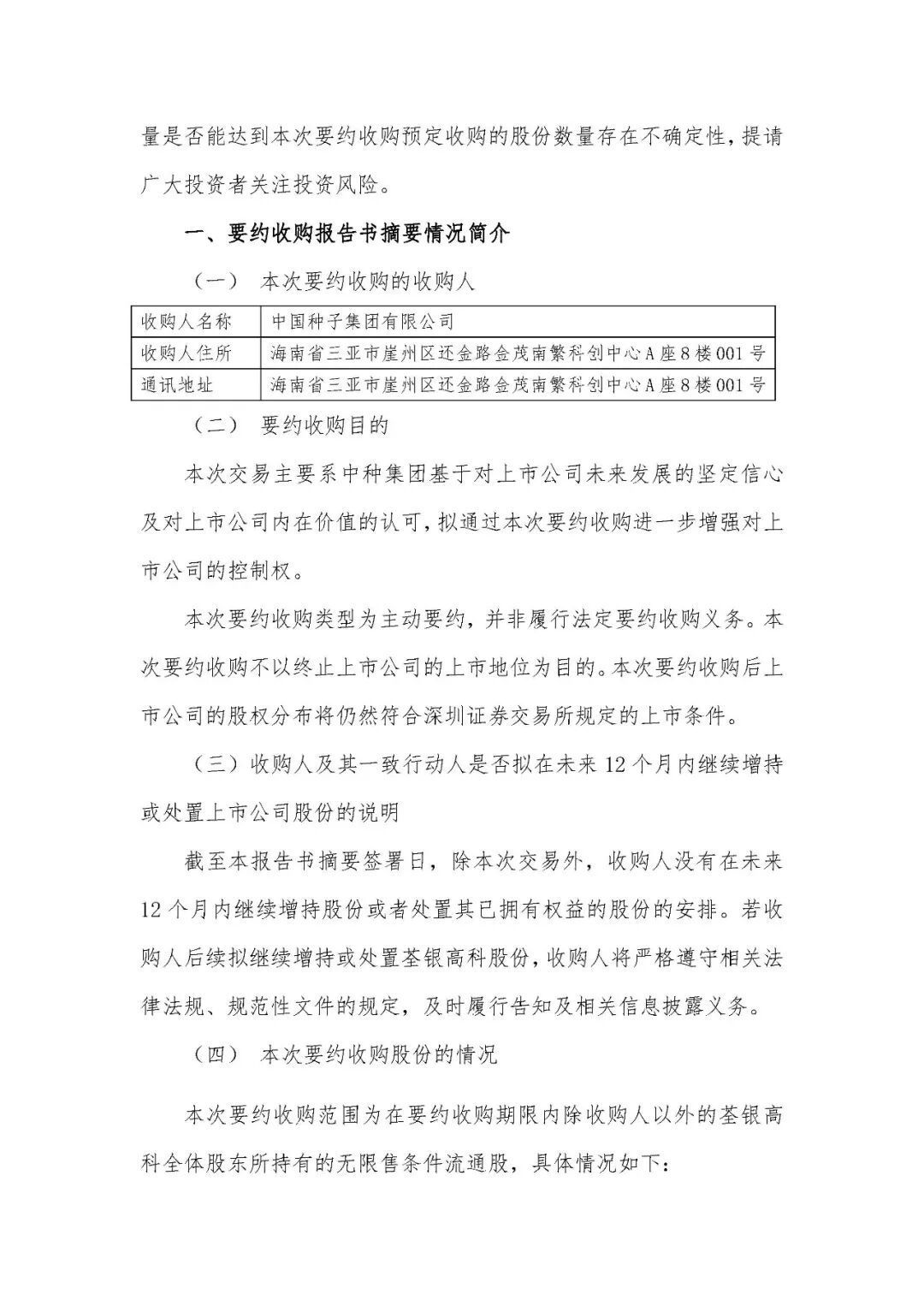 对于要约收购目的,荃银高科表示,本次交易主要系中种集团基于对上市公司未来发展的坚定信心及对上市公司内在价值的认可,拟通过本次要约收购进一步增强对上市公司的控制权。
